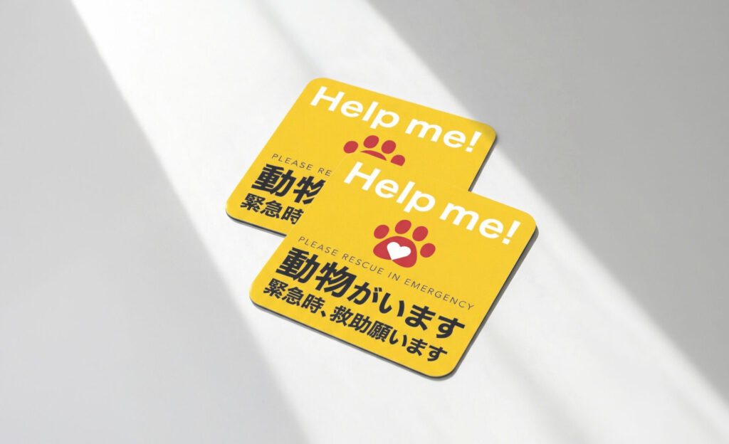 外側には、まずペットがいることに気づいてもらうためのレスキューサイン。内側には、より詳しい情報をまとめたカード。このように二段構えで備えておくと、より実用的です。